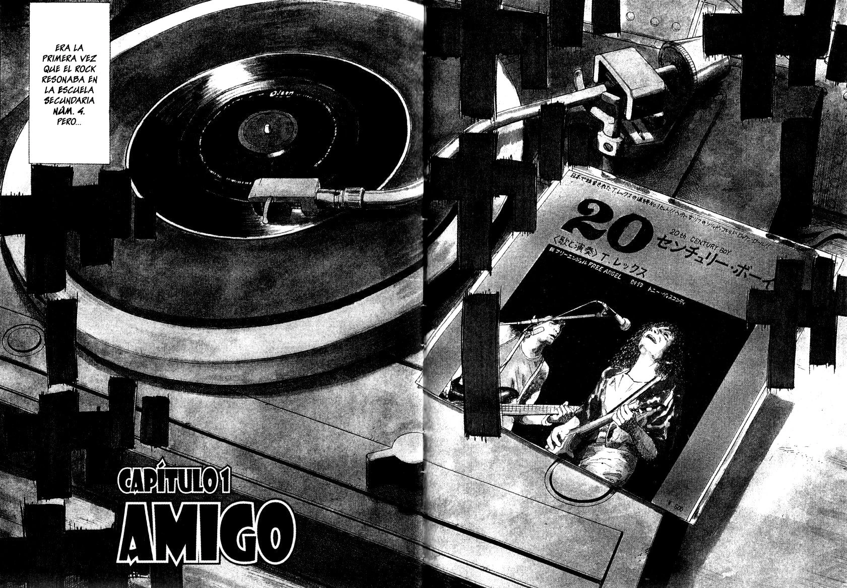 La portada se encuentra en la quinta hoja (décima si contamos los agregados a color), en la parte superior se puede leer «Era la primera vez que el rock resonaba en la escuela núm. 4 pero…», debajo en letra negrita se lee el número y el nombre del capítulo, la imagen muestra un tocadiscos antiguo reproduciendo el disco 20th Century Boy de la banda T. Rex y al costado la imagen de la tapa del álbum, el cual muestra a dos artistas tocando guitarras y cantando.